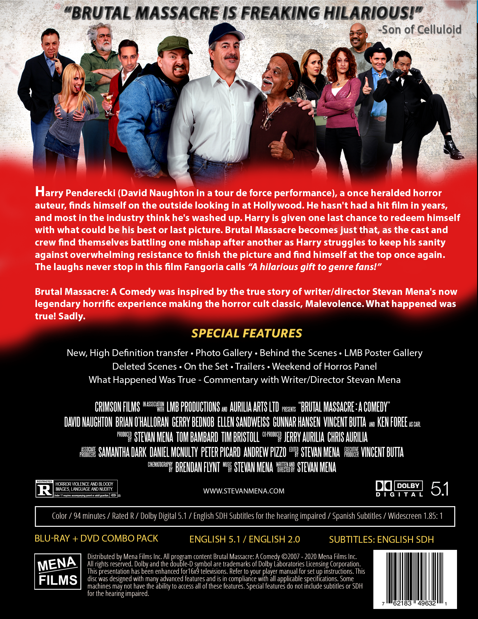 Fangoria magazine calls Brutal Massacre the "Spinal Tap of horror." Featuring a collection of genre veterans Like David Naughton (American Werewolf in London), Brian O'Halloran (Clerks), Gunnar Hansen (Leatherface-Texas Chainsaw), Ken Foree (Dawn of the Dead), Gerry Bednob (The 40 Year Old Virgin), Ellen Sandweiss and Betsy Baker (Evil Dead).